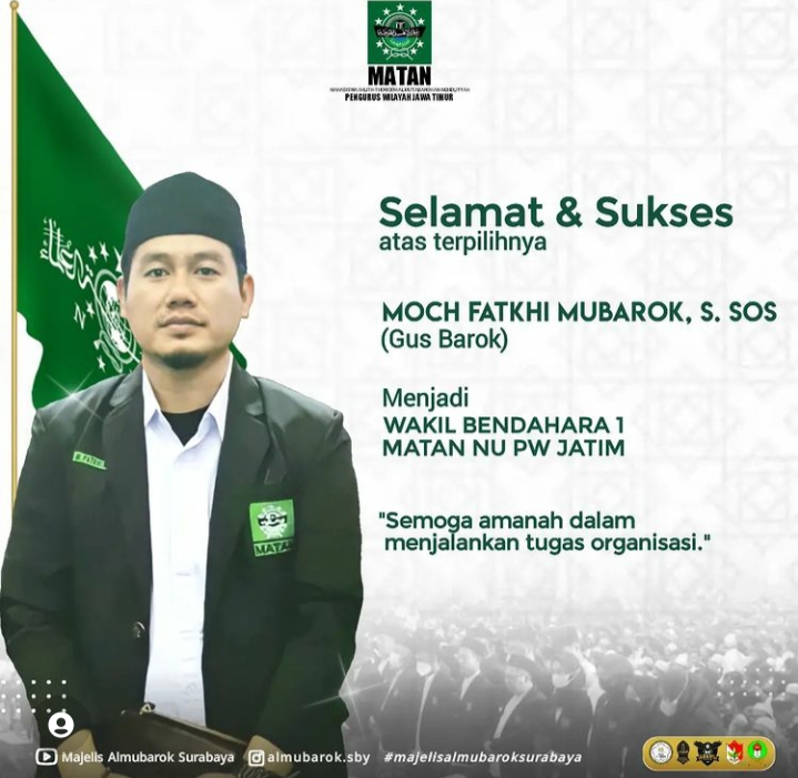selamat dan sukses atas terpilihnya Moch. fatkhi Mubarok,S.SOS (Gus Barok) menjadi wakil bendahara 1MATAN NU PW JATIM.